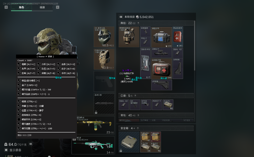 透视功能,显示所有敌人的实时位置和血量、队伍编号、手持武器、骨骼透视。另外还显示各种物资,也可以筛选高价值物品透视显示。